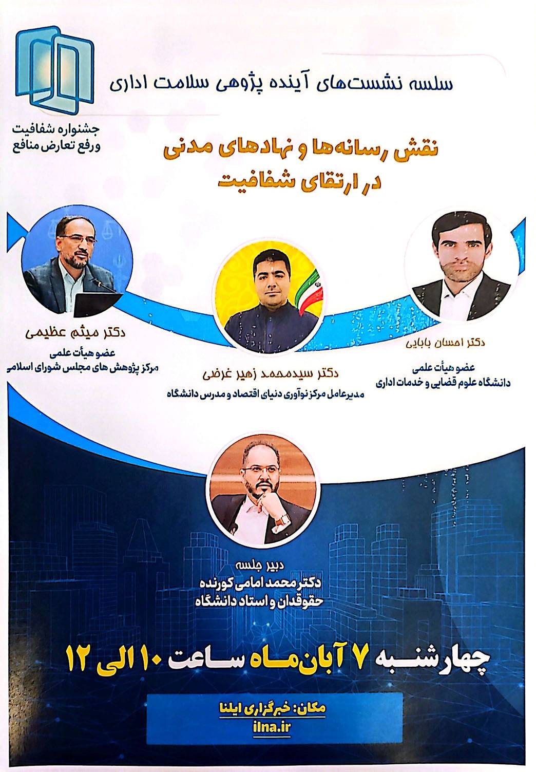 به گزارش روابط عمومی سازمان بازرسی کل کشور، پنجمین میزگرد از سلسله نشست‌های آینده پژوهی سلامت اداری با محوریت «نقش رسانه‌ها و نهادهای مدنی در ارتقای شفافیت» در راستای فرهنگ سازی و مطالبه گری عمومی و به همت سازمان بازرسی کل کشور با حضور متخصصان این حوزه در خبرگزاری ایلنا برگزار شد.