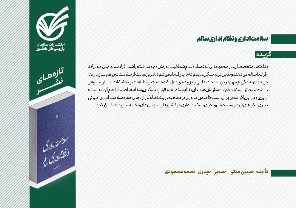 - توصیههای نظارتی قائم مقام سازمان بازرسی به بازرسان و کارکنان سازمان بازرسی/ ضرورت بروزرسانی برنامههای کلان استانها و شناسایی دقیق بسترهای فسادزا/ هشدار به مدیران فاقد صلاحیت و ضعیف/ تشدید نظارت بر دستگاههای ناظر در زمینه موضوعات اقتصادی و معیشتی مردم 04/11/01