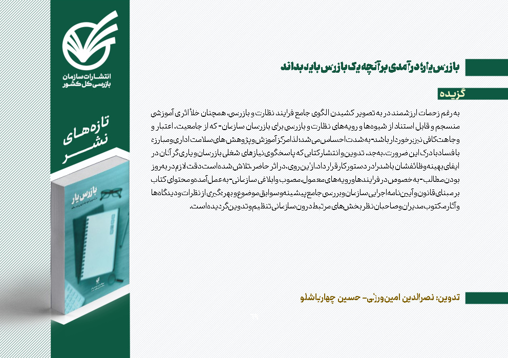 - توصیههای نظارتی قائم مقام سازمان بازرسی به بازرسان و کارکنان سازمان بازرسی/ ضرورت بروزرسانی برنامههای کلان استانها و شناسایی دقیق بسترهای فسادزا/ هشدار به مدیران فاقد صلاحیت و ضعیف/ تشدید نظارت بر دستگاههای ناظر در زمینه موضوعات اقتصادی و معیشتی مردم 04/11/01