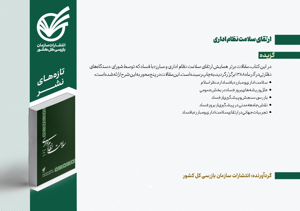 - توصیههای نظارتی قائم مقام سازمان بازرسی به بازرسان و کارکنان سازمان بازرسی/ ضرورت بروزرسانی برنامههای کلان استانها و شناسایی دقیق بسترهای فسادزا/ هشدار به مدیران فاقد صلاحیت و ضعیف/ تشدید نظارت بر دستگاههای ناظر در زمینه موضوعات اقتصادی و معیشتی مردم 04/11/01