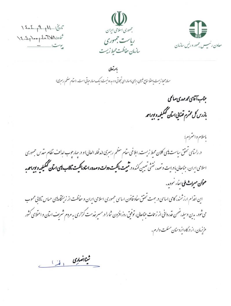 تقدیر رئیس سازمان حفاظت محیط زیست کشور از بازرسی کل استان کهگیلویه وبویراحمد