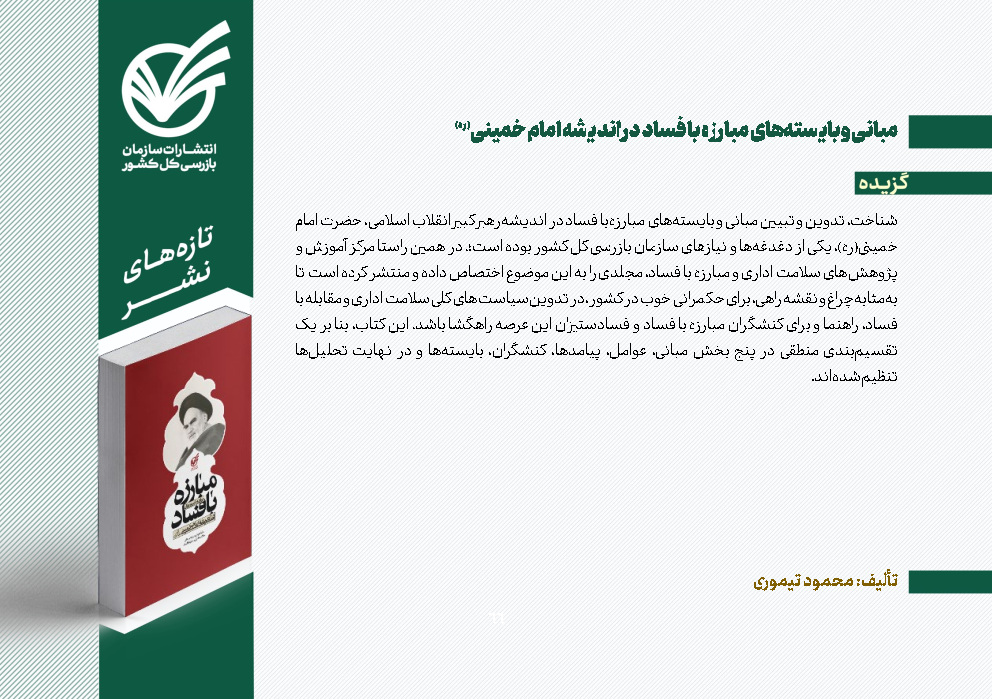 - توصیههای نظارتی قائم مقام سازمان بازرسی به بازرسان و کارکنان سازمان بازرسی/ ضرورت بروزرسانی برنامههای کلان استانها و شناسایی دقیق بسترهای فسادزا/ هشدار به مدیران فاقد صلاحیت و ضعیف/ تشدید نظارت بر دستگاههای ناظر در زمینه موضوعات اقتصادی و معیشتی مردم 04/11/01
